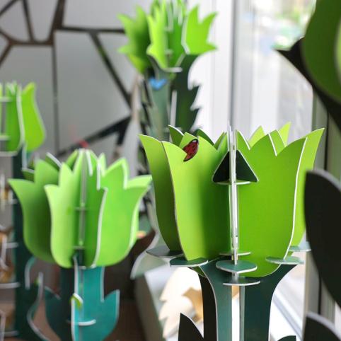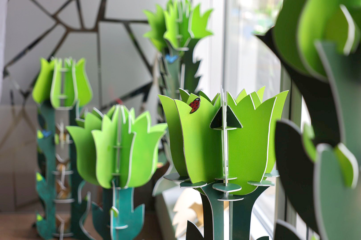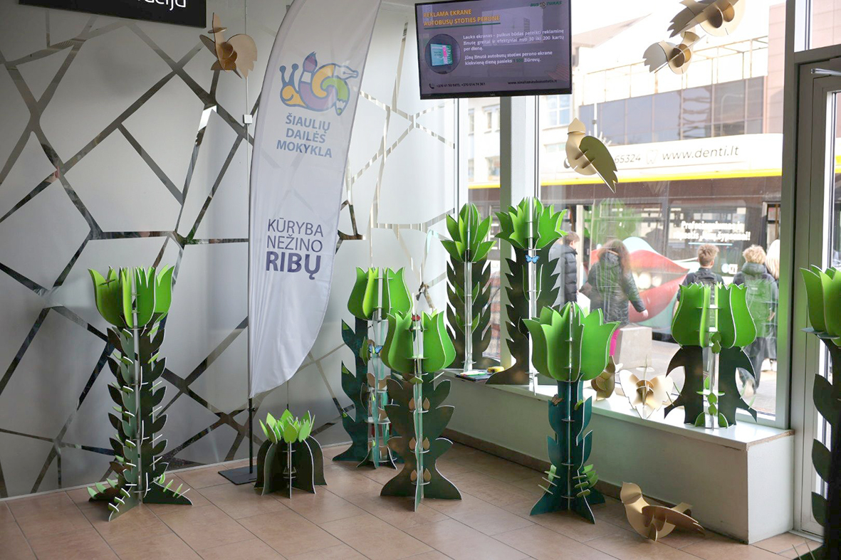 Kompoziciją sudaro pavasarinės, švytinčios jorės ir tamsios žemiškos žalios spalvos gėlės bei aukso spalvos paukščiai, simbolizuojantys atgimimą, šviesą, miesto dvasią ir kilimą į naujas aukštumas. Kiekviena detalė kruopščiai išpjaustyta iš plastiko lakštų, formuota ir apdirbta rankomis – tai kelių mėnesių intensyvaus, kantraus ir kūrybiško darbo rezultatas, kuriuo mokiniai ir mokytojai pagrįstai didžiuojasi.