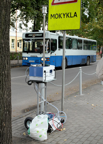 Šiaulių miesto municipalinės aplinkos tyrimų laboratorijos vedėjas Robertas Klimas rodo kietųjų dalelių filtrą. Po vienos valandos intensyvaus transporto priemonių judėjimo (paskaičiuota, jog pravažiavo apie tūkstantis įvairių transporto priemonių) baltas filtras tapo beveik juodu – tiek ant jo nusėdo kietųjų dalelių.