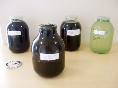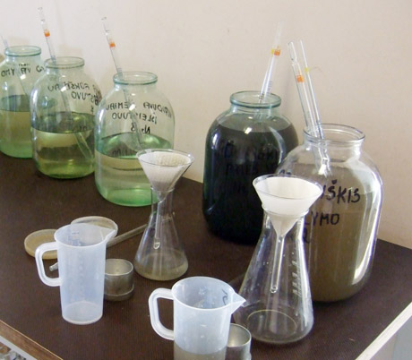 Nuo­te­kų va­lyk­lo­je sto­vė­jo tri­lit­ri­niai stik­lai­niai su paim­tais van­dens mė­gi­niais – iš­va­ly­to van­dens spal­va da­bar bu­vo ge­ro­kai tam­ses­nė nei va­ly­to iki įvy­kio.