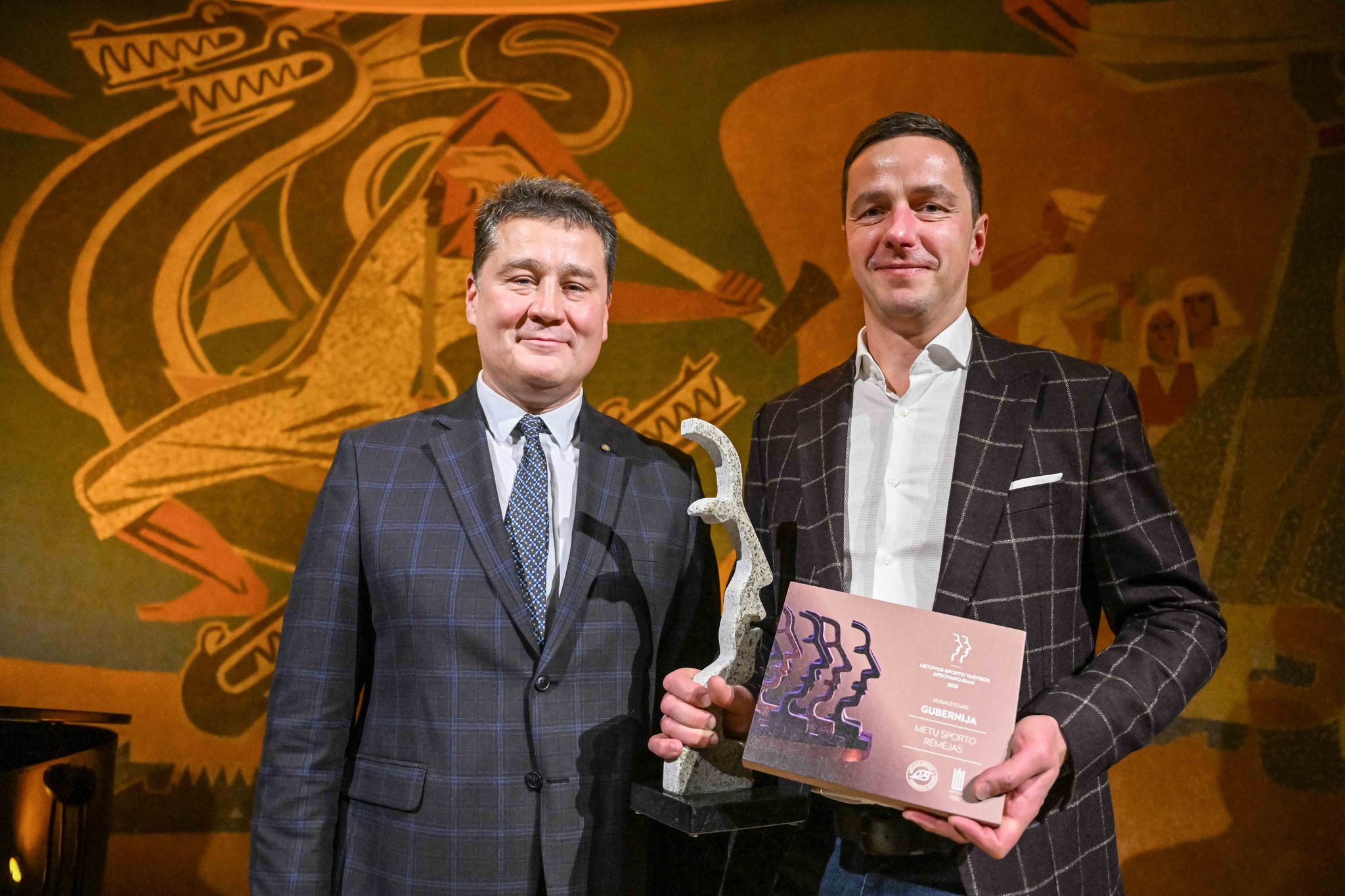 Bendrovės „MV GROUP Production“ generaliniam direktoriui Algirdui Čiburiui (dešinėje) Metų sporto rėmėjo apdovanojimą įteikė Šiaulių miesto savivaldybės Sporto skyriaus vedėjas Gintaras Jasiūnas.