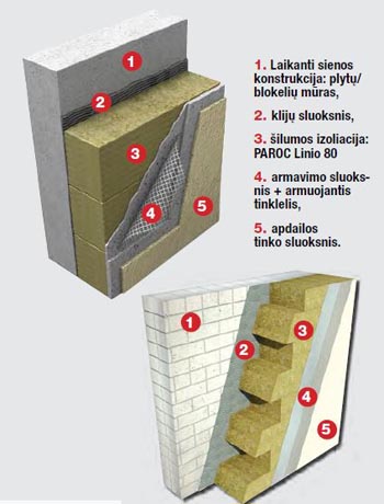 Tinkuojamųjų sienų šilumos izoliacijai rekomenduojama naudoti vertikaliai orientuotųjų plaušų plokštes „Paroc Linio 80“. Jų storis gali būti iki 450 mm, tad jos puikiai tinka ne tik B, bet ir A ar aukštesnės klasės pastatų sienoms šiltinti. Šios plokštės yra sertifikuotos ir įtrauktos tarp populiariausių tinkuojamųjų fasadų sistemų, turinčių Europos techninius įvertinimus ir ženklinamų CE ženklu. Šiltinimo sistemos su vertikaliai orientuotųjų plaušų plokštėmis jau kelis dešimtmečius yra plačiai naudojamos Vokietijoje, Austrijoje, Šveicarijoje.