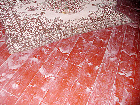 GRINDYS: Džiūdamos šlapios lentos dažytas grindis išmargino baltomis dėmėmis, kurių neįmanoma nei nuvalyti, nei uždažyti.