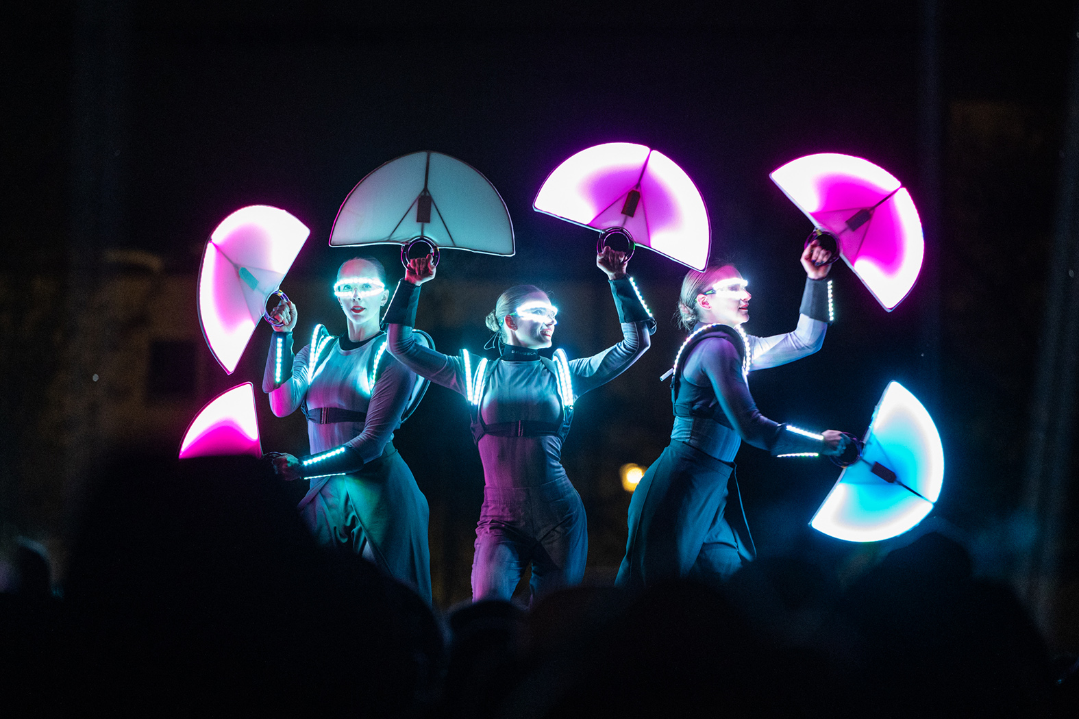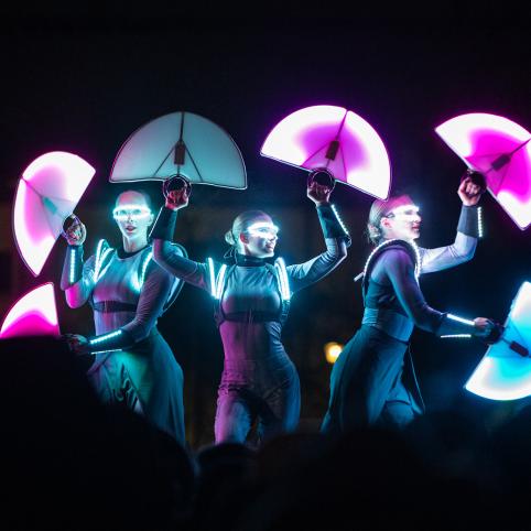 Prisikėlimo aikštėje šviesos ir šokio performansą rodė „Ugnies teatras“: choreografinį pasakojimą papildė šviečiantys kostiumai ir LED technologijos.