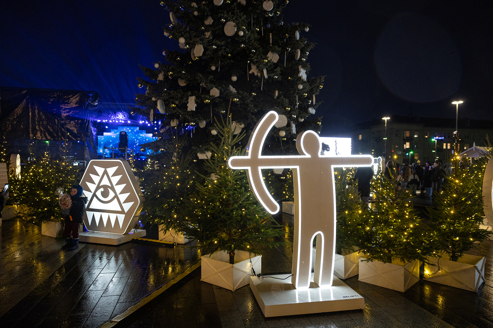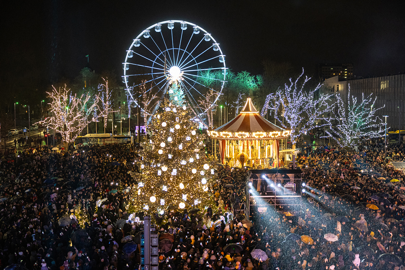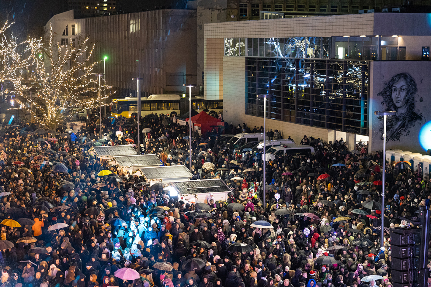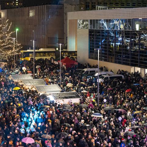 Gruodžio 6-osios vakarą Šiauliuose nušvito Kalėdų eglė. Lietus šventės nesugadino – žiūrovų prisirinko pilnutėlė Prisikėlimo aikštė ir jos prieigos.