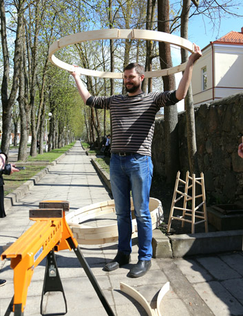 ŠVIESTUVAS: Dizaineris Martynas Olšauskas kartu su kolega iš baldų gamyboje naudojamų medienos dalių kurs didelį lauko šviestuvą.