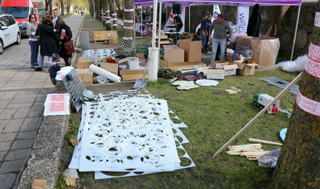 Vakar Kaštonų alėjoje pastatytose palapinėse kūrėjai apžiūrinėjo turimas priemones: metalo, plastiko, medžio, audinių dalis ir atraižas. Netrukus prasidėjo kūryba.