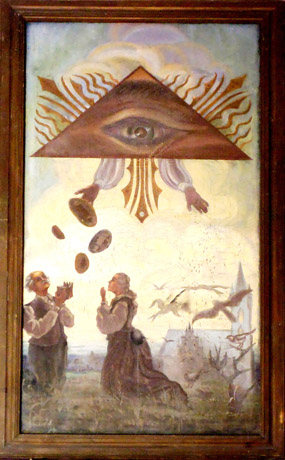 Apa­ti­nė pa­veiks­lo da­lis – si­met­ri­nė sa­vo pra­sme, asi­met­ri­nė vaiz­du. Kai­rė­je – šei­ma. Mel­džia­si vy­ras ir žmo­na. Atk­reip­ti­nas dė­me­sys į rū­bus, tiks­liau – į bal­tus marški­nius, šven­ti­nę at­ri­bu­ti­ką, su­si­šau­kian­čia su Lie­tu­vos krikš­to me­tu žmo­nėms do­va­no­tais bal­ti­niais. Mal­da – dva­si­nė šven­tė, o tie iš dan­gaus by­ran­tys ke­pa­lai – dva­si­nis pro­duk­tas, Die­vo lab­da­ra, su­si­šau­kian­ti su kas­die­ny­bės duo­na, vals­tie­čio pra­kai­tu gim­do­ma. De­ši­nė­je, ato­kiau – paukš­čiai. Jiems kai­rio­ji Ap­vaiz­dos ran­ka bars­to tru­pi­nius, nors jie „nei sė­ja, nei pjau­na“. Spar­nuo­čiai – mal­dos fo­nas, pa­veiks­lo ant­ras pla­nas, gy­ve­nan­tis ne žmo­nių, o paukš­čių gy­ve­ni­mus.