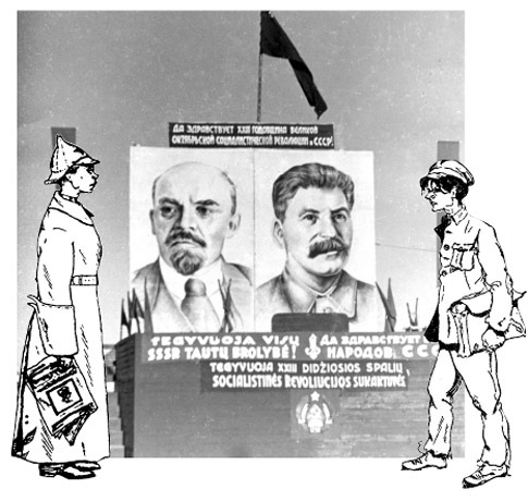 Iliustracijoje – pirmoji šventinė tribūna Šiauliuose, minint Didžiojo Spalio 23-iąsias metines dabartinio Dvaro turgaus teritorijoje. Piešinukuose – „klozetininkai“: anuometinis ir dabartinis (iš autoriaus archyvo).