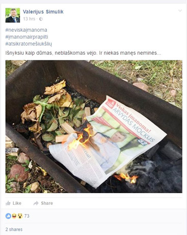 Socialiniame tinkle „Facebook“ V. Simulik po pergalės tą pačią naktį, sekmadienį po 22 val., pasidalijo „džiaugsmo pikniko“ nuotrauka: šašlykinėje dega A. Mockaus reklaminis laikraštis. Įrašą jis pažymėjo ironiškomis grotažymėmis #neviskaįmanoma, #įmanomairprapilti, #atsikratomešiukšlių bei poetiniu prierašu „Išnyksiu kaip dūmas, neblaškomas vėjo. Ir niekas manęs neminės...“