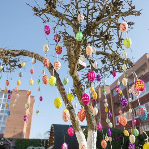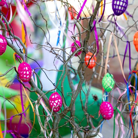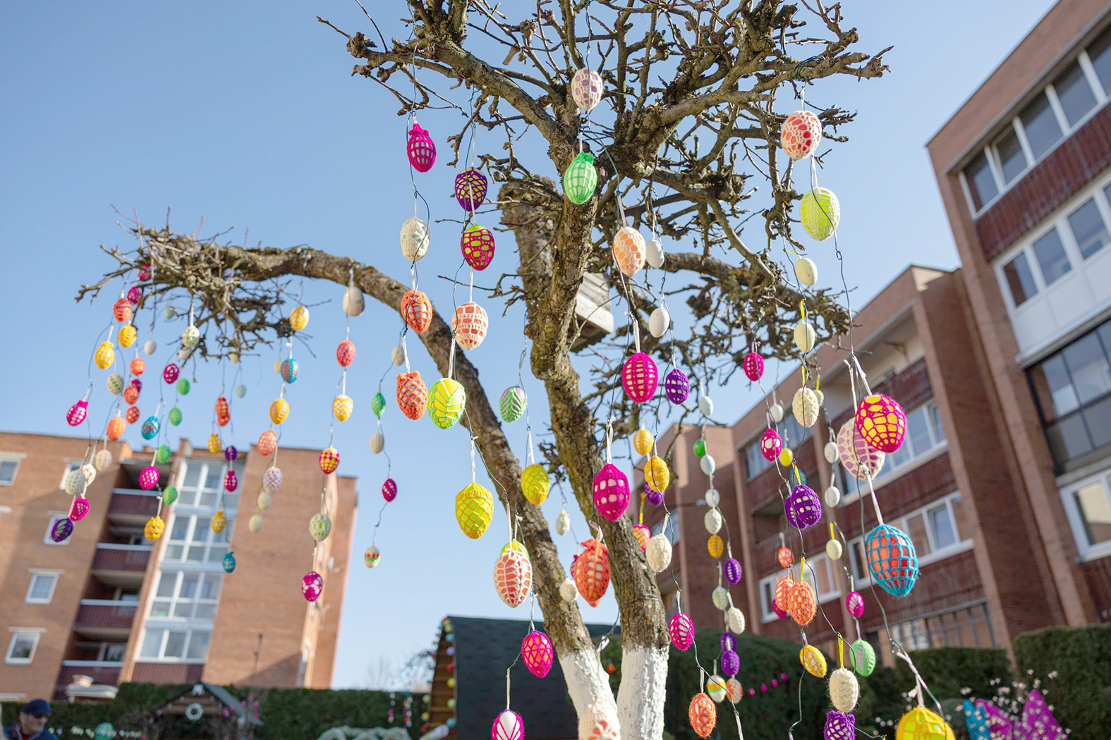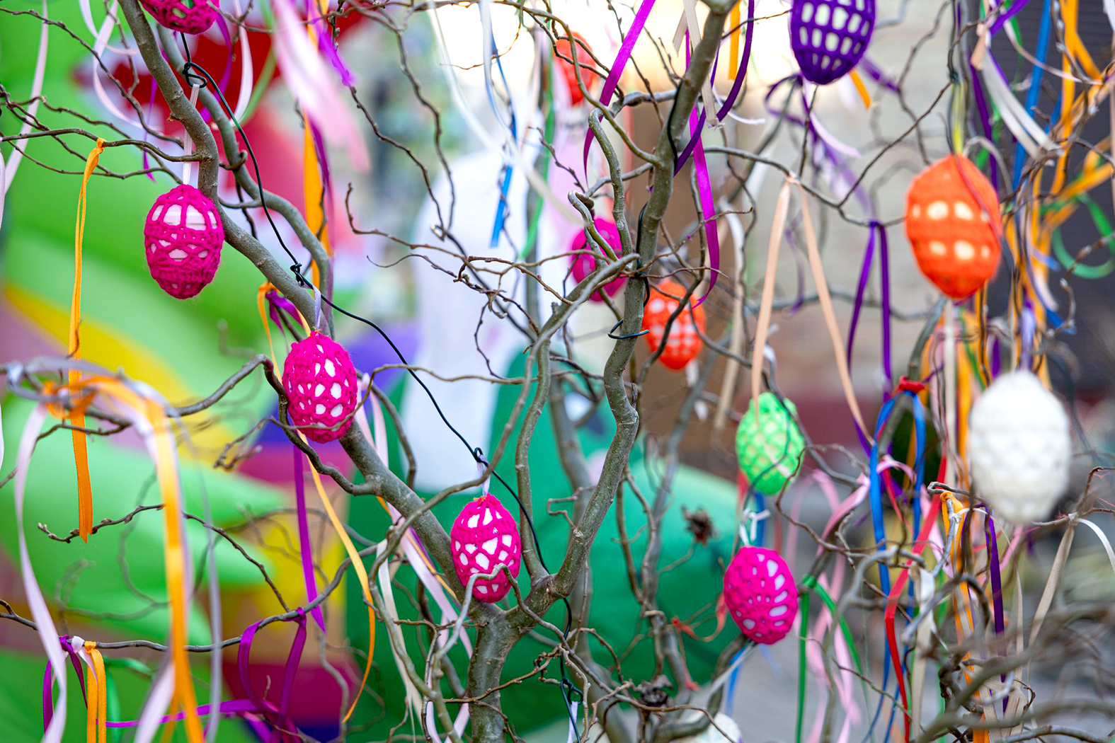 Taip pat prisijungia draugai, kaimynai. Viena bičiulė spalvingai apmezgė daugybę kiaušinių, kaimynė iš savo sodo atvežė gražią medžio šaką. Ant jos kiekvienas užsukęs gali užrišti spalvingą juostelę – gal išsipildys koks velykinis noras. Kita kaimynė padovanojo iš medžio šakelės išpjaustytomis detalėmis dekoruotus margučius.
