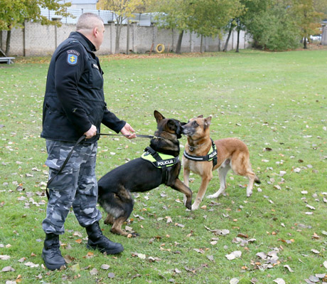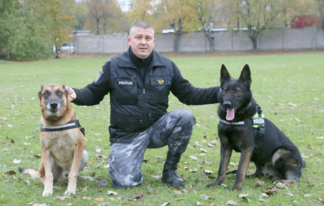 Šiaulių apskrities policijos Kinologų būrio vadas Arūnas Petrošius su draugais Natu (kairėje) ir Brix.