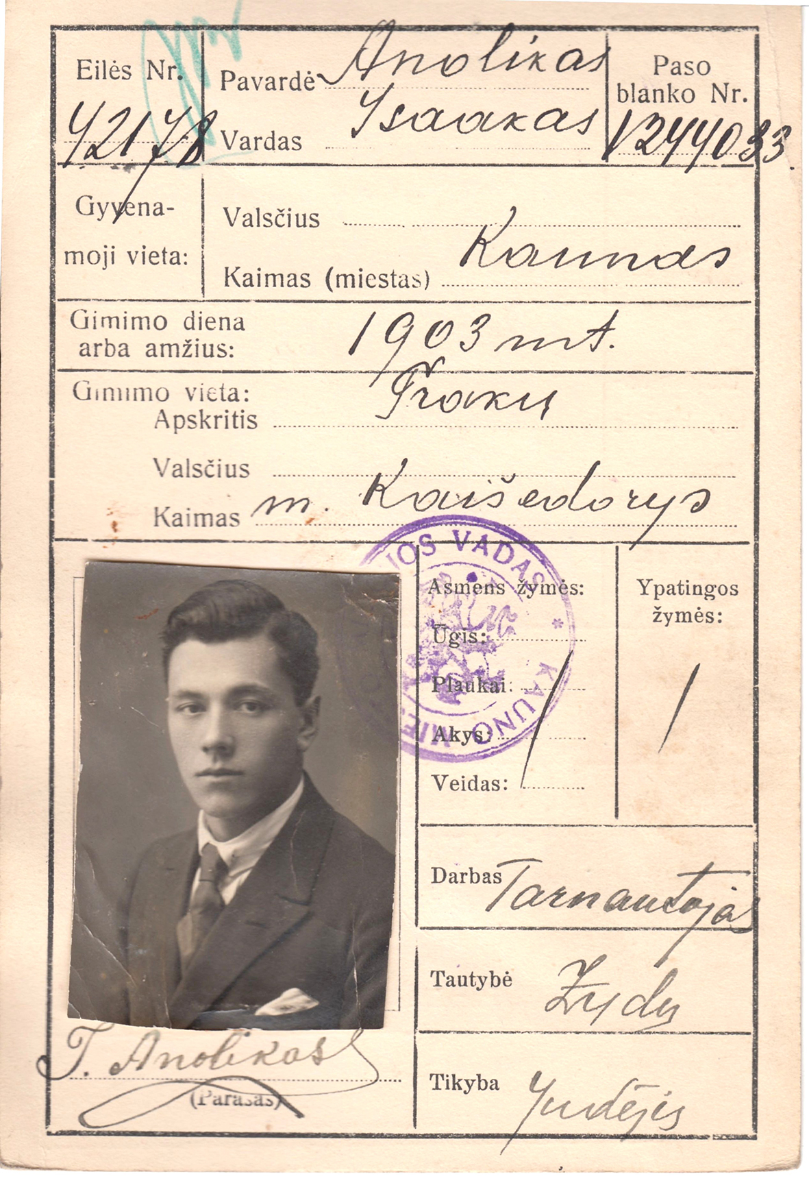 Paso kortelė nurodo, kad Isakas (Isaakas) Anolikas gyveno Kaune, o gimė 1903 m. Trakų apskrityje, Kaišedoryse (Kaišiadoryse – A. P. past.). Ši paso kortelė yra publikuojama ir Martyno Mažvydo bibliotekos kultūros paveldo portale.
