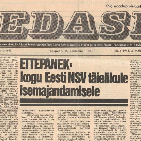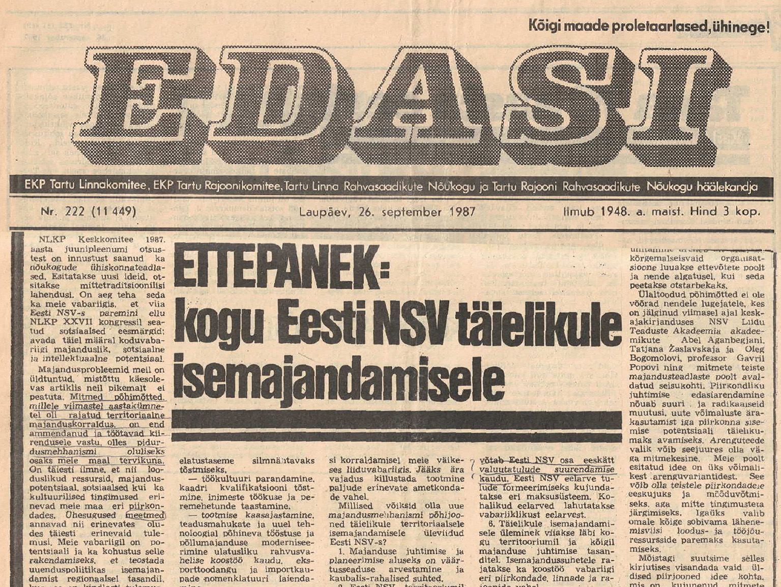 Kalbama apie 1988 metų pradžią. „Vasario 3 d. Šiaulių „Raudonoji vėliava“ paskelbė verstą iš estų spaudos stebėtinos drąsos projektą – „Pasiūlymą dėl Estijos TSR visiškos ūkiskaitos“.