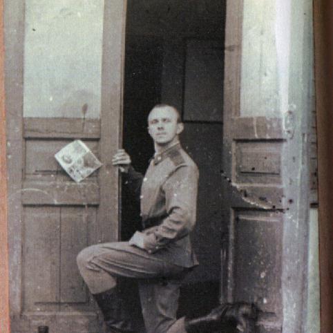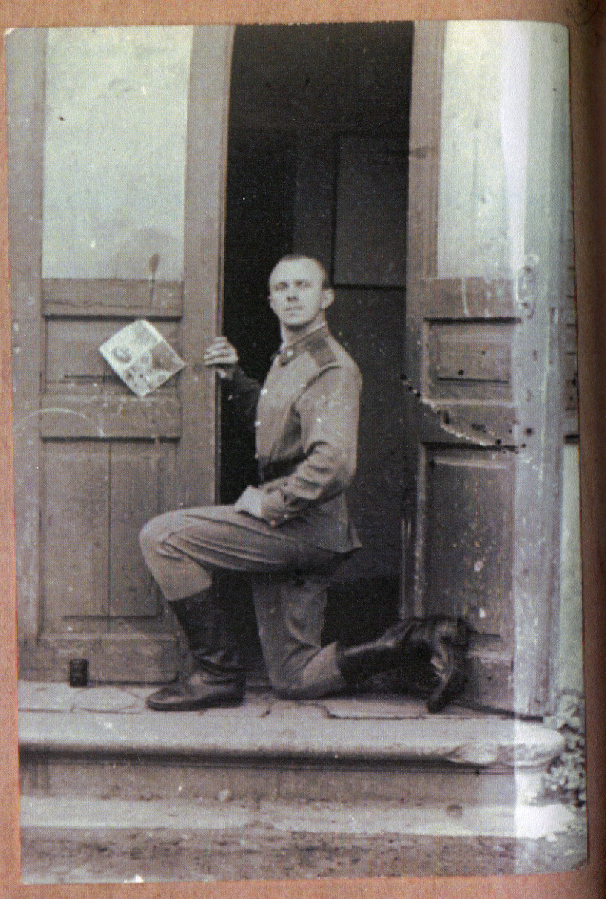 Rygoje, “naujokų turguje”, buvau pašauktas leitenantuko, su gražia uniforma, kuri man visai patiko. Taigi, formaliai priklausiau pėstininkams, buvau gražuolis, nes turėjau raudonus antpečius ir raudoną kepurę, ko dar? Pasirodo, man pavyko. Iki manęs buvo suformuotas dailininkų “vzvodas” (būrys), kuris Rygoje turėjo įrengti “Karinės šlovės muziejų”, bet dailininkus paleido namo. Į laisvą vietą patekau aš. Ir pačiu laiku.