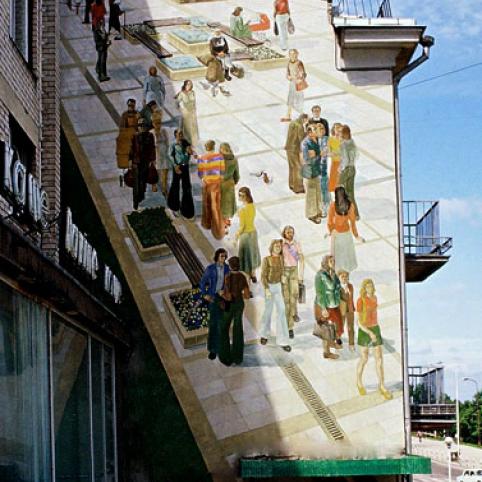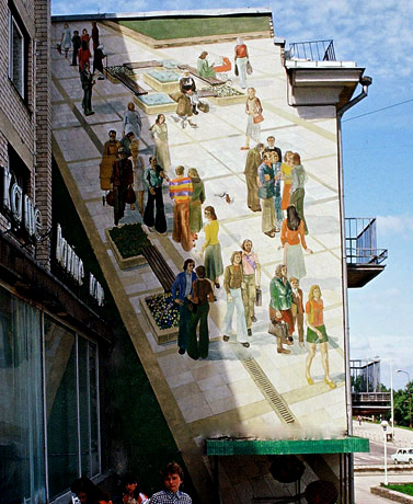 – Tai iliuzorinis Šiaulių studento „dailioko“, neseniai palikusio šį pasaulį Ričardo Ničajaus tapybos kūrinys „Bulvaro perspektyva“. Sumanyta bulvarą pratęsti ant sienos: tas pats plytelių raštas ir pažįstami žmonės. Susidaro pirmas įspūdis apie laimingą, sotų gyvenimą, tik geriau įsižiūrėjus pamatydavai pirmame plane jaunuolius platėjančiomis kelnėmis, merginą mini sijonėliu – į tokią madą to meto partinukai žiūrėdavo labai įtariai. Šalia – „babytė“, pas kurią kambarį nuomojo dailininkas, su anūkėliu grįžtanti iš turgaus. Kiek tolėliau skrybėlėtas veteranas blizgančiais auksiniais dantimis, ilsisi ukrainietė, atvažiavusi į Pribaltiką apsipirkti: ji laukia draugių, išeinančių iš univermago, lukštena ir spjaudo saulėgrąžas – štai kodėl šalia būrelis balandžių.