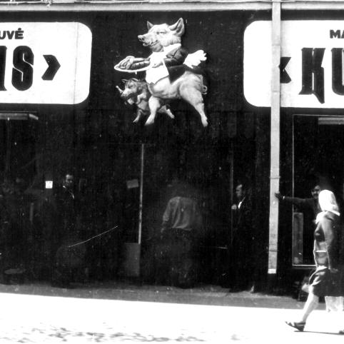 – Bekelnis Paršelis virš mėsos parduotuvės durų – labiau pasišaipymas nei reklama: mėsinė be mėsos: hiperrealybė ir akiplėšiškumas!