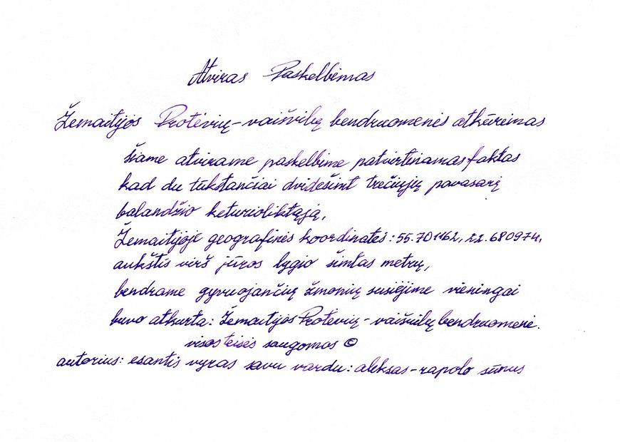 Šiame atvirame paskelbime patvirtinamas faktas, kad du tūkstančiai dvidešimt trečiųjų pavasarį, balandžio keturioliktąją, Žemaitijoje, geografinės koordinatės: 55.701162, 22.680974, aukštis virš jūros lygio šimtas metrų, bendrame gyvuojančių žmonių susiėjime vieningai buvo atkurta: Žemaitijos Protėvių–vaišvilų bendruomenė.