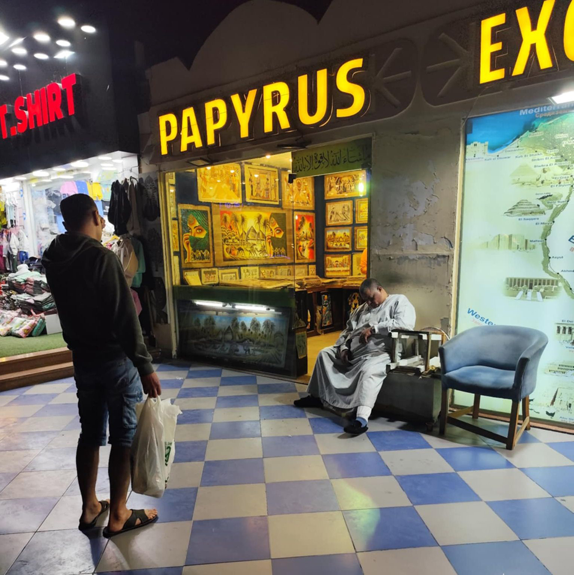 Krūva į Egiptą besigrūdančių turistų – krūva penkių dolerių banknotų! Sistema tokia: paduodi savo pasą ir jau po minutės ar kelių atgauni jį kartu su užpildytu lapeliu, kuriame, paskaitome, įrašytas vardas, pavardė (ironiška, bet su šiurkščia klaida), paso numeris ir data. Egiptietiška penkių dolerių vertės paslauga atlikta.