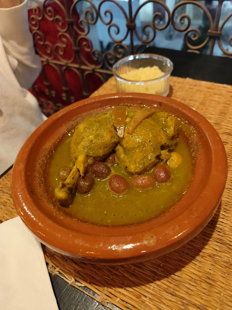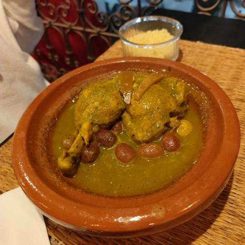 Apskritai Marokas nėra pigi šalis. Patiekalai kavinėse kainuoja tiek pat, kiek ir Lietuvoje. Pagrindinis jų nacionalinis patiekalas – tadžininas su įvairios rūšies mėsa, žinoma, išskyrus kiauliena. Galimas ir vegetariškas variantas. Tadžinas yra marokietiškas molinis indas: dubenėlis, uždengtas specifiniu į viršų siaurėjančiu dangčiu. Šiame inde troškinama mėsa. Skanu, tačiau mums pritrūko daržovių. Pavyzdžiui, vištienos gabalas patroškintas vos su keliomis alyvuogėmis.
