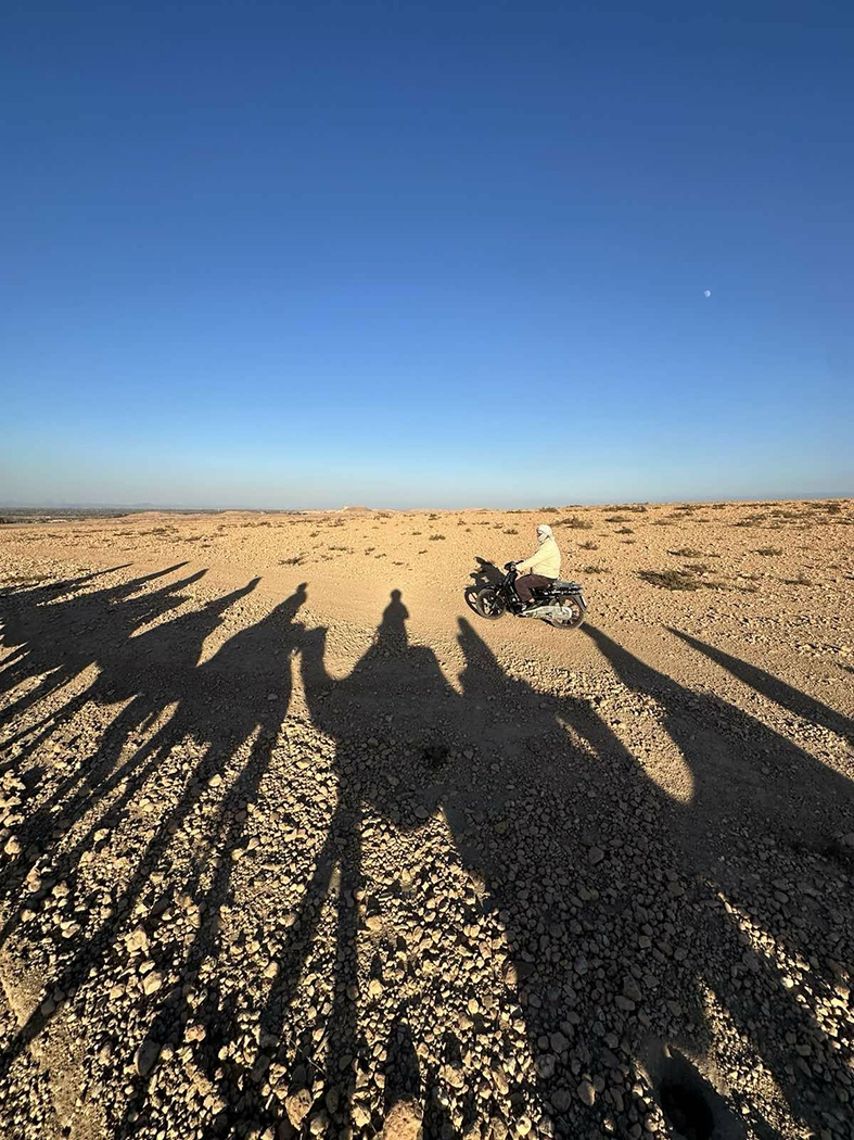 Porą valandų pasimėgavusios žaluma ir jos grožiu, keliaujame į kitą unikalią gamtos vietą – Sacharos dykumą. Dykuma šalia Marakešo nėra smėlėta. Tai daugiau uolienų ir akmenų dykuma, tolumoje įrėminta Atlaso kalnais.