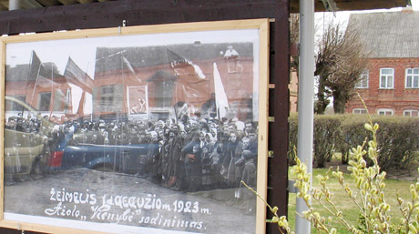 ISTORIJA: Miestelio centre eksponuojama istorinė nuotrauka, kurioje įamžinta Vienybės ąžuolo sodinimo šventė. Už nuotraukos stendo – pastato, esančio nuotraukoje, fragmentas.