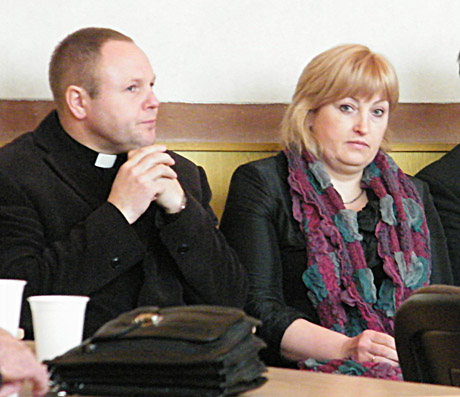 PRAŠYMAS: Tytuvėnų parapijos klebonas Rimantas Žeromskis Tarybos narių prašė žmogiškumo – padėti bendruomenei atsiskaityti su rangovais už sutvarkytą, įrengtą šarvojimo salę. (Šalia – Tytuvėnų bendruomenės pirmininkė Irma Ridikienė).