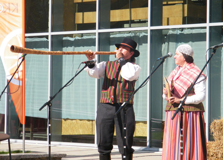RAGAS: Folkloro festivalio „Ir pajauga žali leipa“ pradžią paskelbė folkloristo Osvaldo Gerbenio pučiamo rago garsai. (Šalia – festivalio vedančioji Rita Ščiglinskienė)