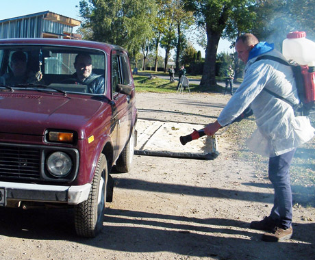 PRATYBOS: Per pratybas demonstruota, kaip automobilis pravažiuoja dezobarą ir yra dezinfekuojamas.