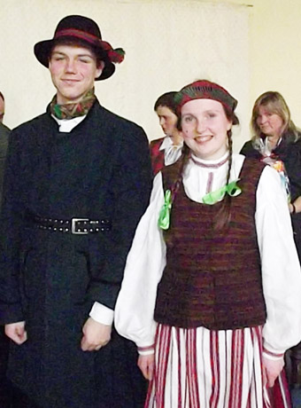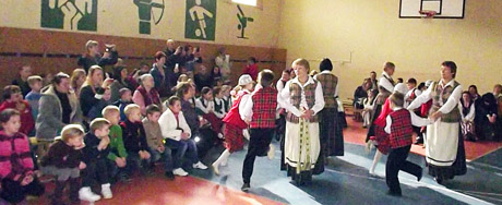 ŠVENTĖ: Sporto salėje sukosi tautiniais rūbais vilkinčios poros, surengtos liaudiškų dainų varžytuvės. Skambėjo ir vaikų, ir suaugusiųjų atliekamos dainos.