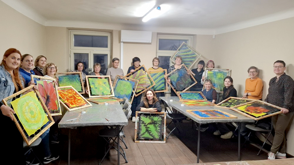 Edukacijos dalyvės tapė ant šilko, susikurdamos šilkines skareles, kurios panašios į meno kūrinius.