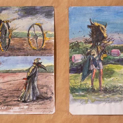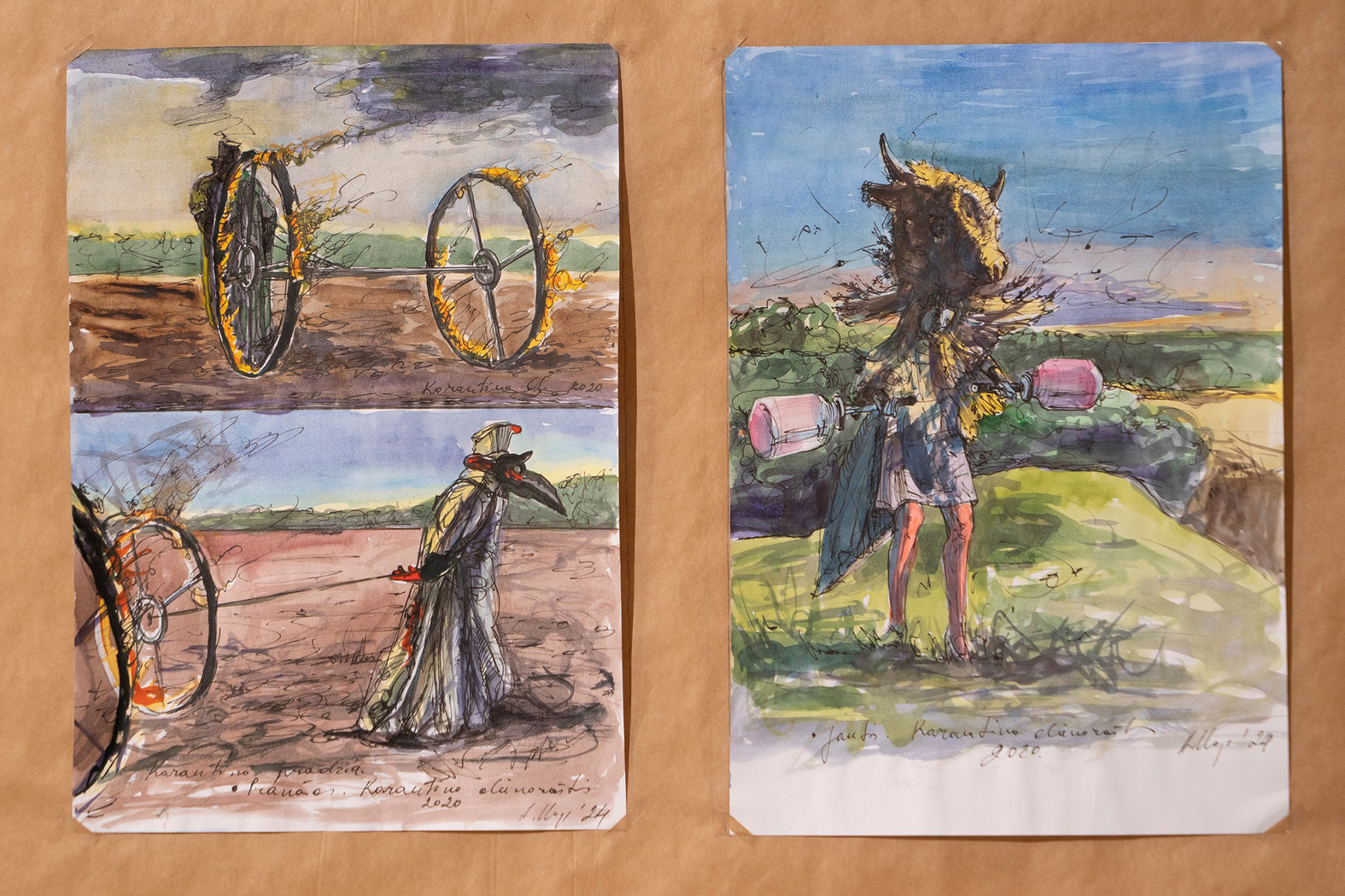 Renginio dalyviai iš pirmų lūpų išgirdo apie kūrybinę laboratoriją – filmavimo subtilybes. Pasakojimą papildė rekvizitai, akvarele sukurti eskizai bei videoperformansų scenarijai.