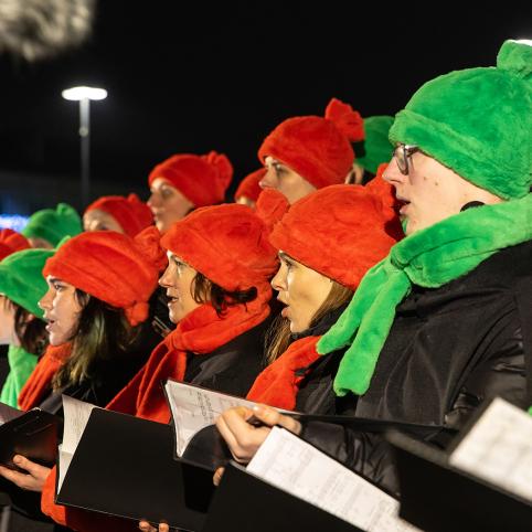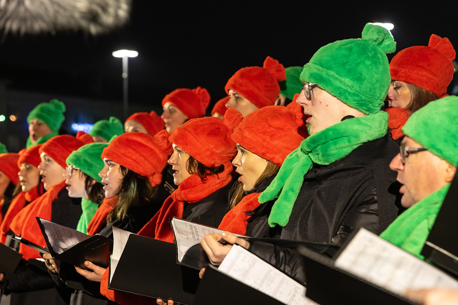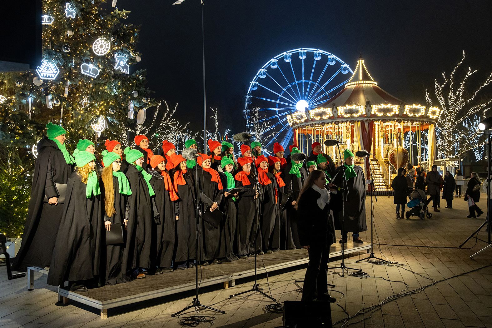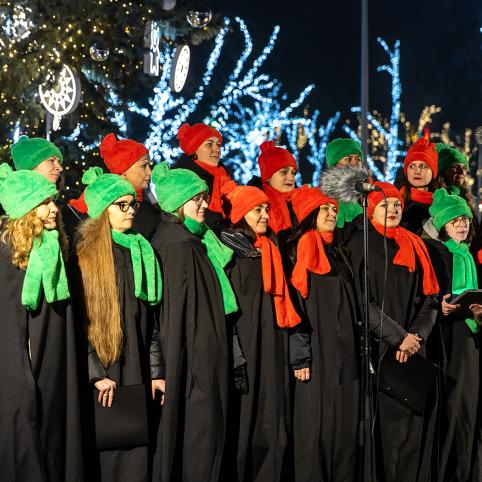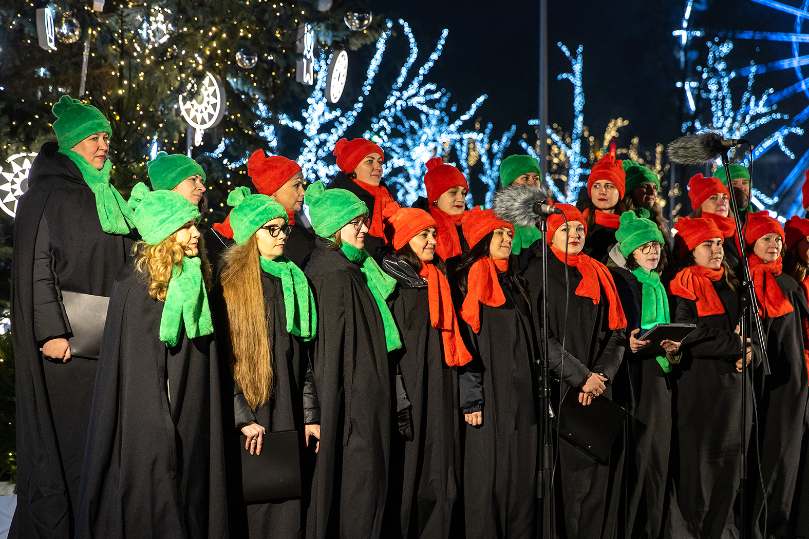 Prie pagrindinės miesto eglės populiarias kalėdinio laikotarpio giesmes giedojo Šiaulių kultūros centro kamerinis choras „Atžalynas“, vadovaujamas Mindaugo Žalalio.