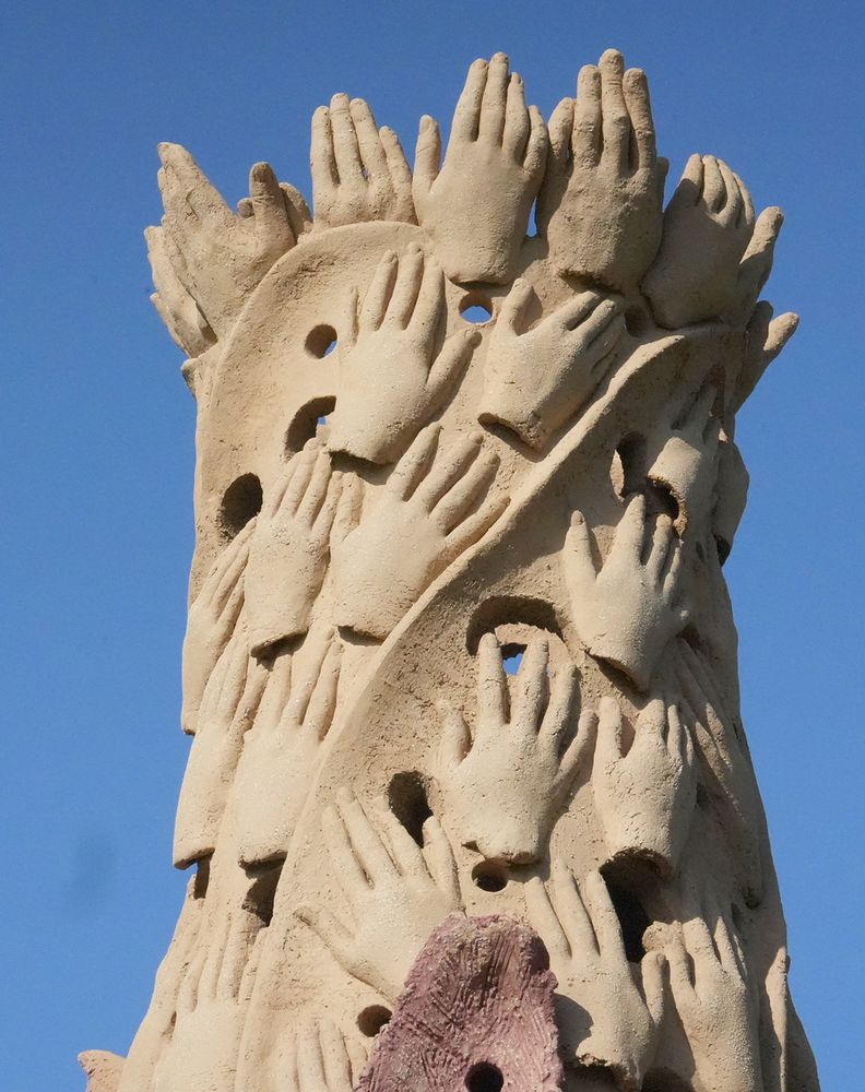 Šiauliečiai skulptoriai Irena ir Vilius Šliuželiai savo skulptūroje pavaizdavo rožės pumpurą ir daugybę rankų. Savo plaštakas čia galėjo įspausti Užventyje gyvenantys žmonės. Savo darbą pavadino „Tik neapleisk gėlių darželio“. „Kūryba Užventyje – tai iš artimų žmonių bendrystės gimstanti paskata puošti savo kraštą, dovanoti jam kūrinius, didžiulis kūrybos džiaugsmas“, – plenero ir savo kūrinio prasmę aiškina keramikė, šamoto skulptūrų autorė Irena Šliuželienė.