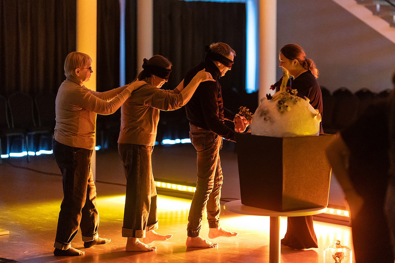 Renginio pradžioje žiūrovai klausėsi garsinės kūrinio santraukos. Vėliau prie kiekvieno dalyvio priėjo vedliai, lydėję į pojūčių pasaulį.