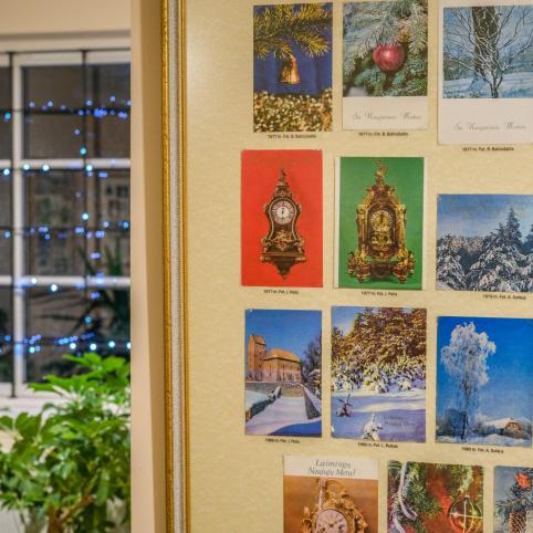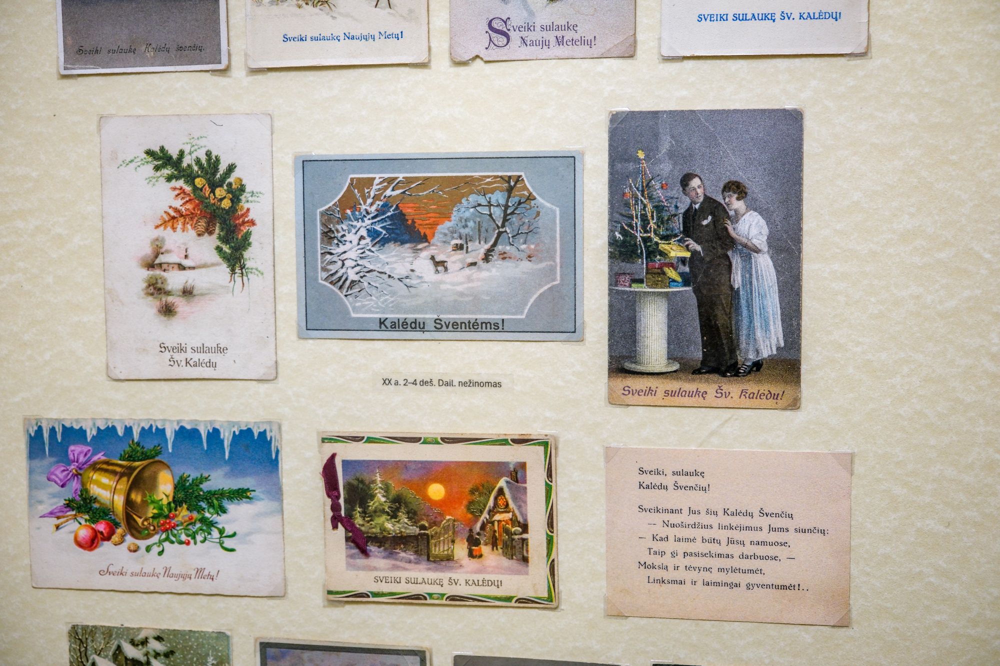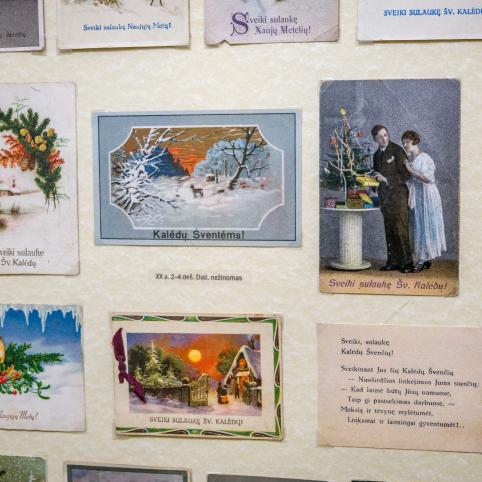 Senaisiais kalėdiniais žaisliukais išpuoštose dvaro erdvėse lankytojams pristatomi 662 lietuvių dailininkų, fotografų kurti ir kiti Lietuvoje bei užsienyje XX a. pr. – 9 deš. spausdinti lietuviški kalėdiniai ir naujametiniai atvirukai, vokai.