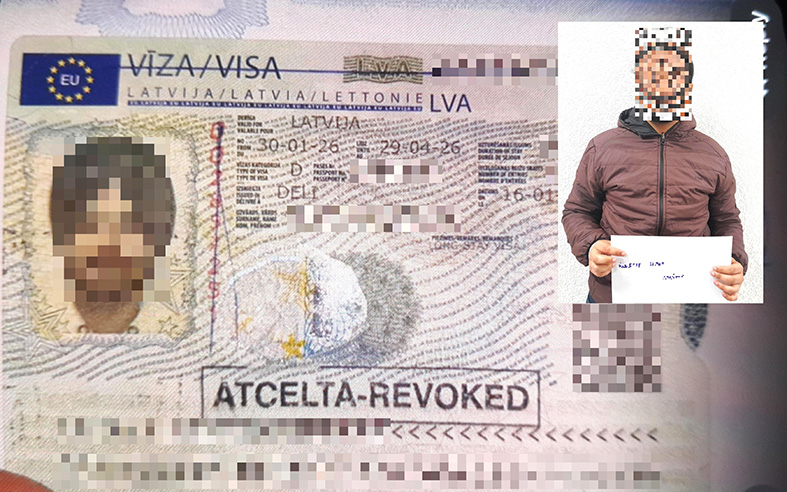 Valstybės sienos apsaugos tarnybos (VSAT) pareigūnams keleivis parodė Indijos piliečio pasą su jame įklijuota panaikinta nacionaline Latvijos viza.