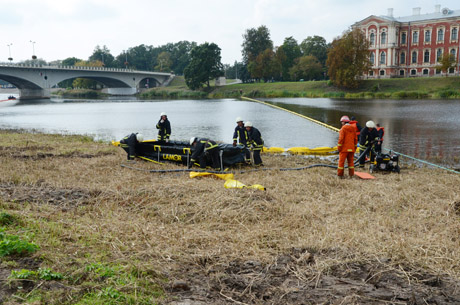 Antrąją dieną Lielupės upėje vyko praktinės pratybos, kurių metu buvo mokomasi stabdyti naftos produktų išsiliejimą upėje.